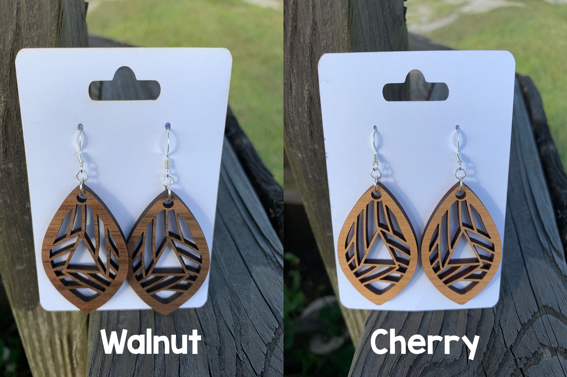 Every piece of wood is naturally different, the grain in your jewelry may differ slightly from the wood in the photograph.